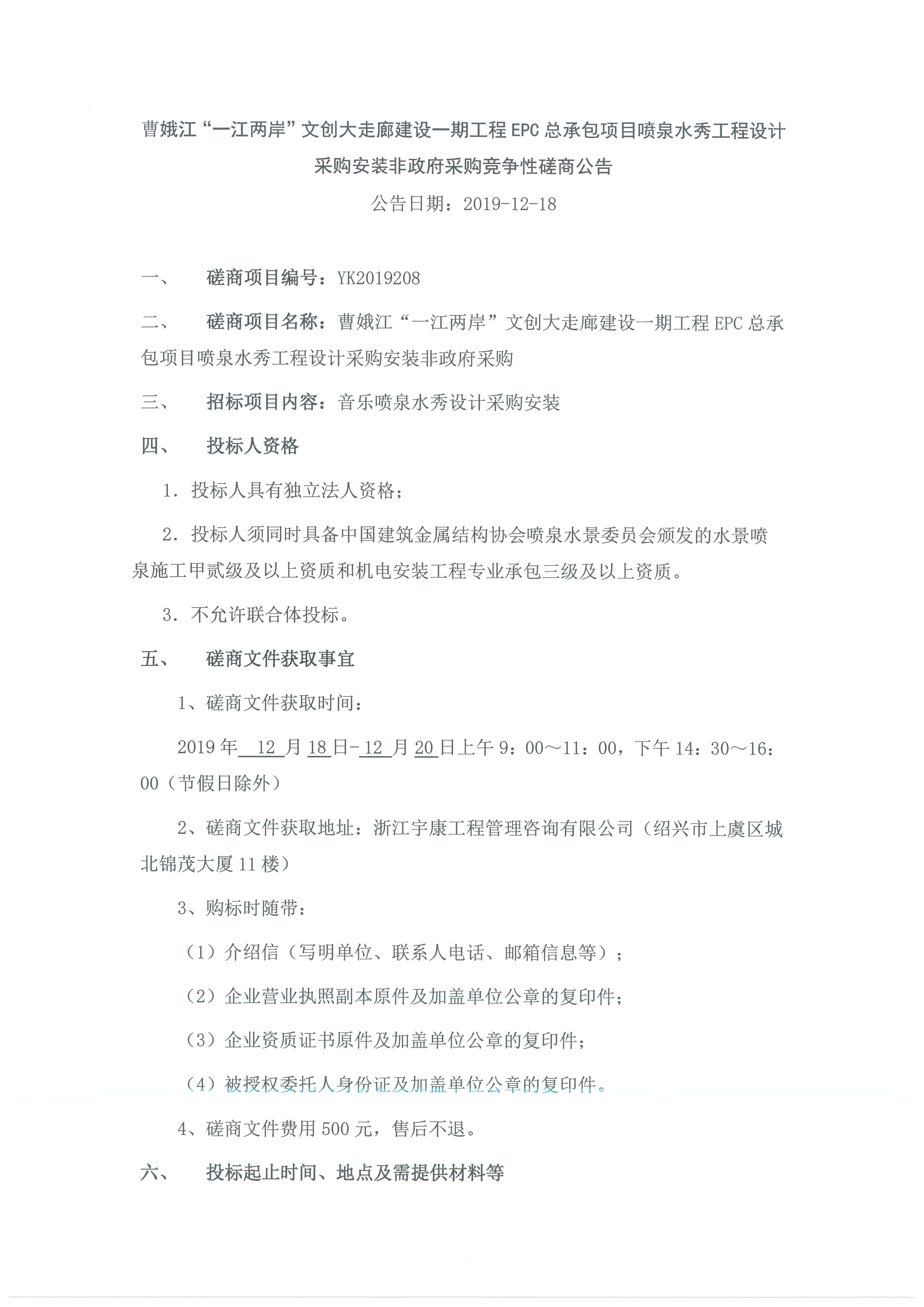 二、 磋商項目名稱:曹娥江“一江兩岸”文創大走廊建設一期工程EPC總承包項目噴泉水秀工程設計采購安裝非政府采購